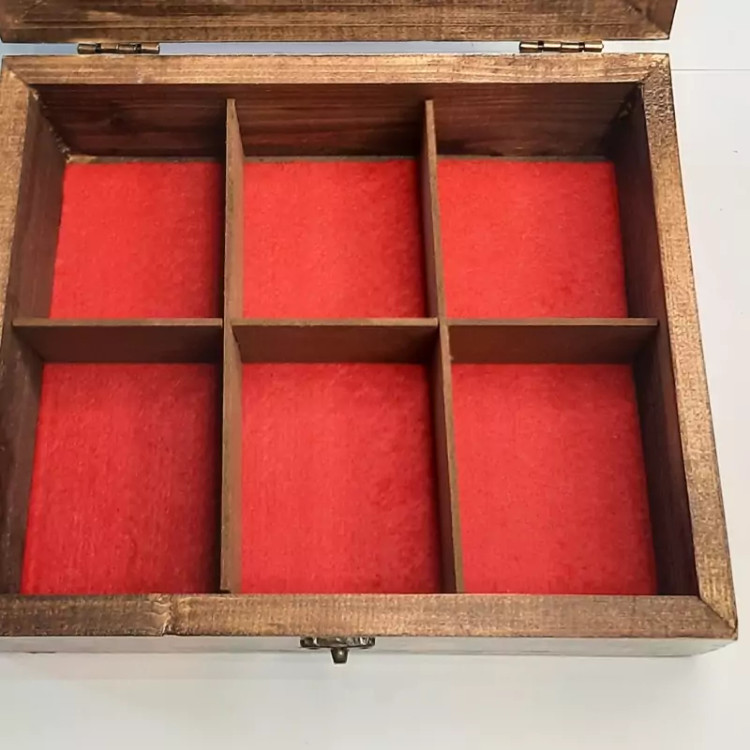 جنس چوب نراد شش خانه مناسب دمنوش و تیبگ با برداشتن جداکننده های داخل باکس به عنوان صندوقچه نگهداری اشیا و جواهرات قابل استفاده است