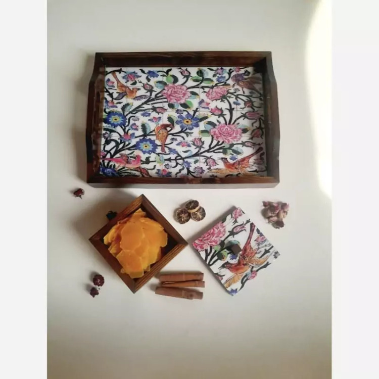 ست سینی و جاشکلاتی چوبی طرح دار همراه با روکش رزین