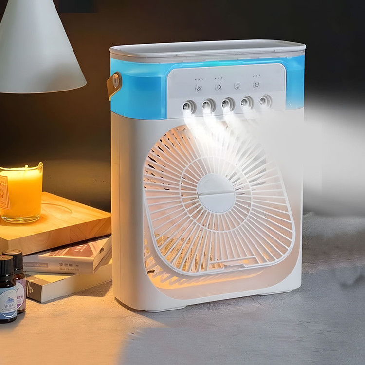 شارژی بودن و قابلیت حمل آسان، آن را به همراهی کاربردی در تمامی فصول تبدیل کرده است.پنکه رومیزی چندکاره با قابلیت بخور سرد و مهساز شارژی، همراه با چراغ LED داخلی، انتخابی بینظیر برای خنک و مرطوب نگه داشتن محیط است.